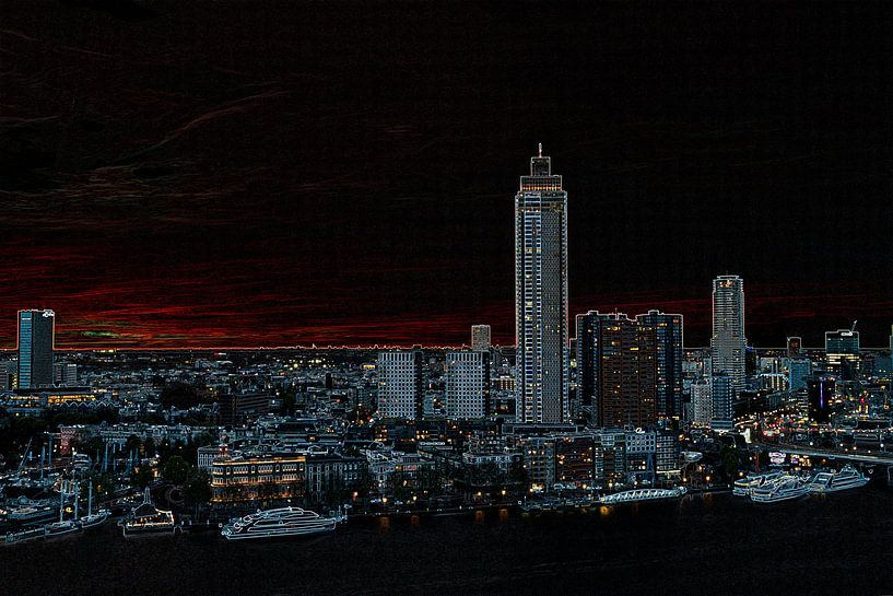 J'ai pris cette photo depuis le WPC de Rotterdam. Le soleil se couchait magnifiquement sur Rotterdam. Les premières lumières de la ville se sont allumées. Un beau spectacle de lumière. Et au milieu de la ville, la grande tour Zalm !