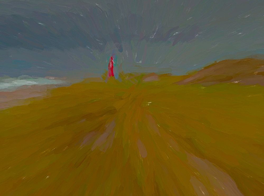 Dans les dunes, juste sur la plage, se dresse une tour rouge. Un phare. Sous le ciel gris avec ses nuages parfois sombres, la mer s'échoue sur cette plage. Les Whitecaps, les vagues. L'herbe de la plage est encore à peine visible dans cette création abstraite. Une atmosphère et plus encore, comme vous le recherchiez... La côte néerlandaise....