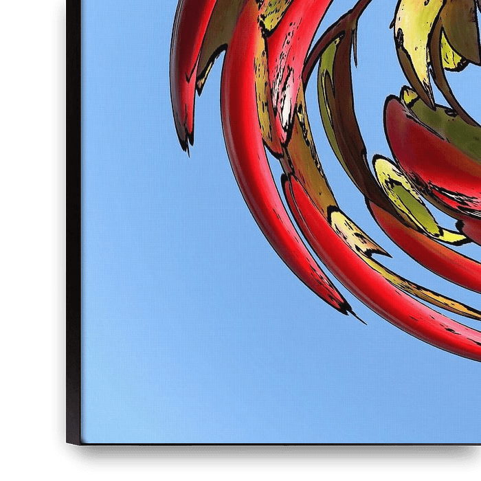 Cette composition numérique présente un tourbillon dynamique de formes organiques dans des tons de rouge, de vert et de brun, sur un fond bleu vif. Les structures déformées, presque feuillues, créent une impression de mouvement et d'énergie, tandis que le contraste avec le bleu apaisant fait ressortir davantage les formes. L'ensemble…