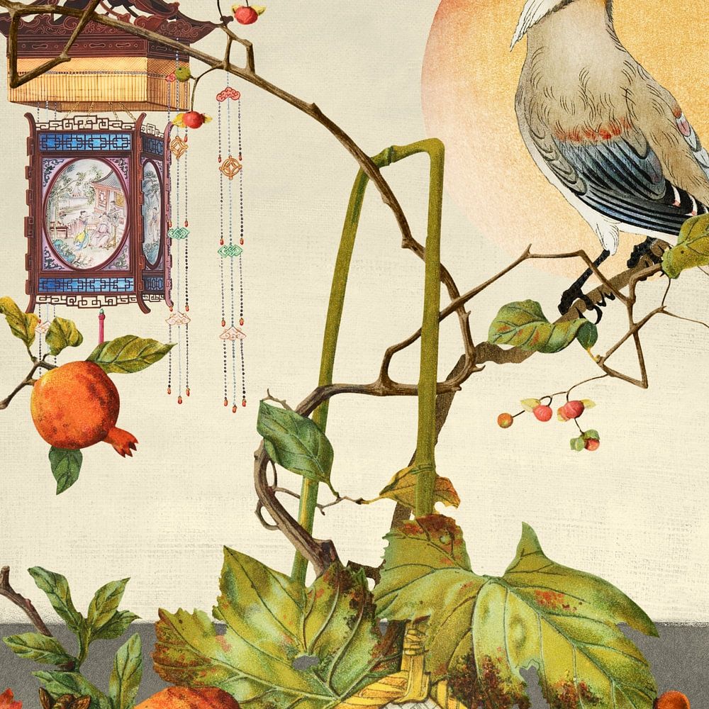 Scène automnale et estivale avec oiseau, panier, fruits et lanterne.
