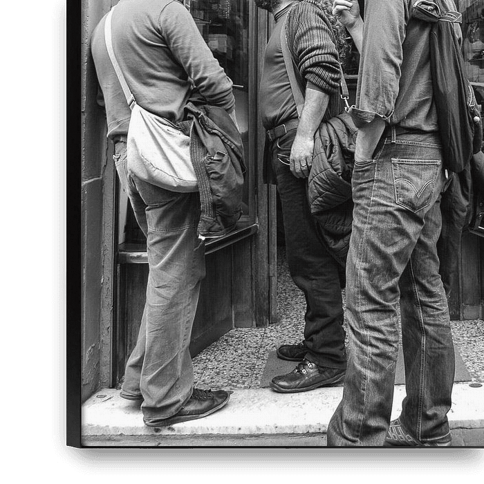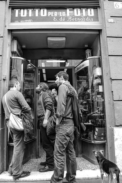 Trois photographes et un petit chien se tiennent devant l'un des plus anciens magasins de photographie de Rome. Leur attitude et leur conversation détendue créent une image captivante.