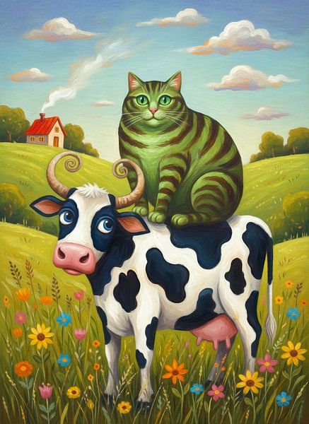 Une scène bizarre montre un chat à rayures vertes assis sur une vache noire et blanche. En arrière-plan, on peut voir une prairie luxuriante avec des fleurs multicolores.