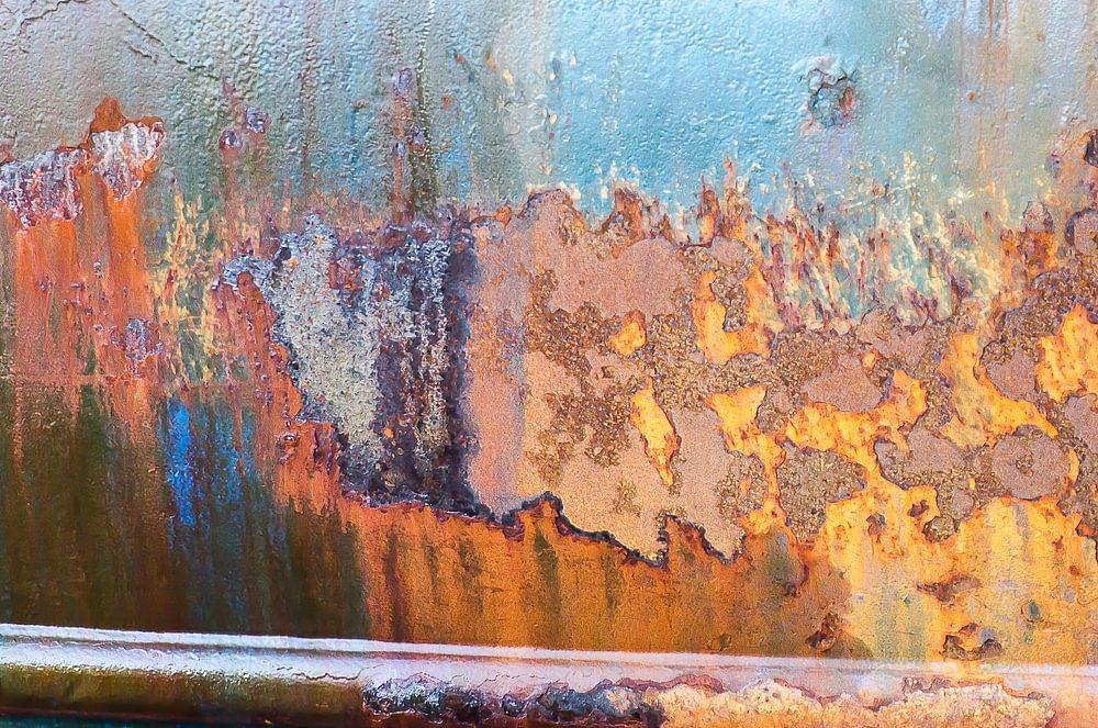 Les couleurs principales sont le bleu et le brun rouille, sur ce morceau de coque de navire divisé en trois plans par des soudures solides. Mais en regardant de près, on peut découvrir d'autres couleurs.