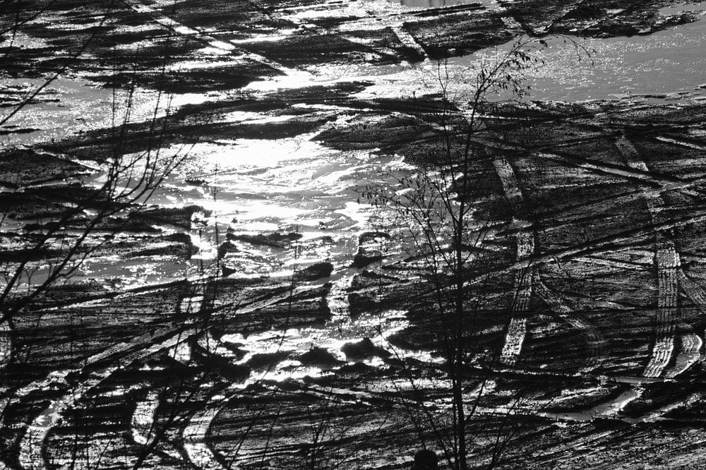 Terrain de chantier boueux en hiver qui est gelé en contre-jour en noir et blanc