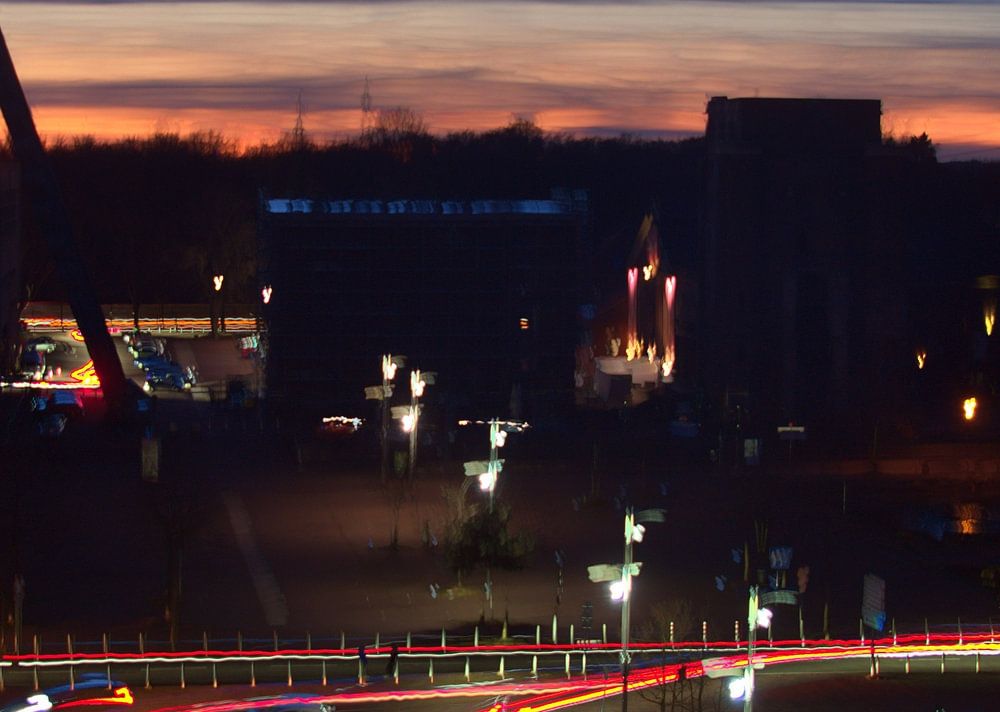 Scène du soir aux chevalements de la mine Ewald à Herten avec les traces lumineuses des automobilistes qui s'y rencontrent.