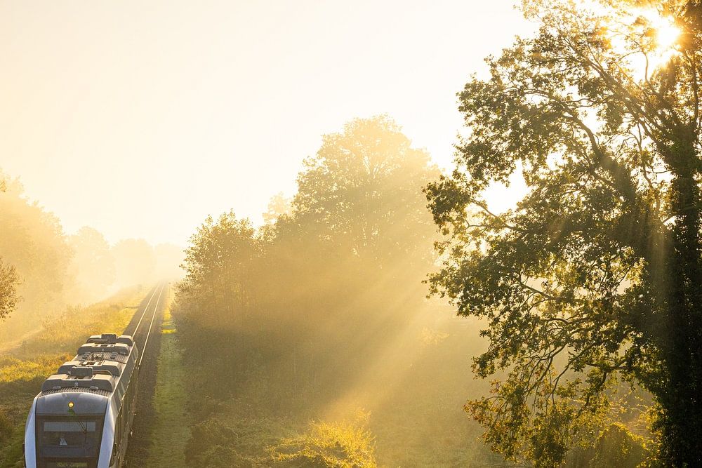 Un train Arriva de type LINT circule sur la section de voie Zutphen - Lochem, traversant ici un magnifique paysage brumeux où le soleil brille à travers les arbres avec des rayons de soleil.