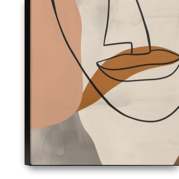 L'image montre une représentation stylisée et abstraite d'un visage, encadrée par des couleurs douces dans des tons beiges et terre. Les lignes marquées confèrent au visage une structure claire, tandis que les éléments minimalistes créent une atmosphère harmonieuse et calme. La bouche fermée et les formes douces des paupières dégagent…