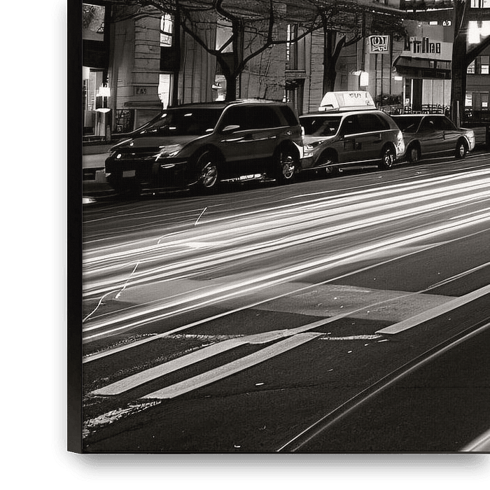Cette étonnante photographie en noir et blanc capture l'agitation et la beauté d'une ville moderne la nuit. La longue exposition crée un jeu fascinant de traînées de lumière, tandis que les gratte-ciel s'élèvent de manière imposante à l'arrière-plan. Cette œuvre d'art donne vie à la dynamique de la vie urbaine, parfaite pour les…
