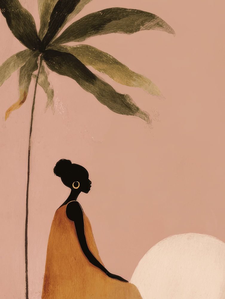 Un portrait minimaliste mais chaleureux d'une femme sous un arbre tropical alors que le soleil descend lentement à l'horizon. Les tons doux de la terre et la silhouette donnent à l'œuvre une impression de sérénité et de méditation. Parfait pour les intérieurs qui souhaitent ajouter du calme, de la chaleur et une touche d'ambiance exotique.