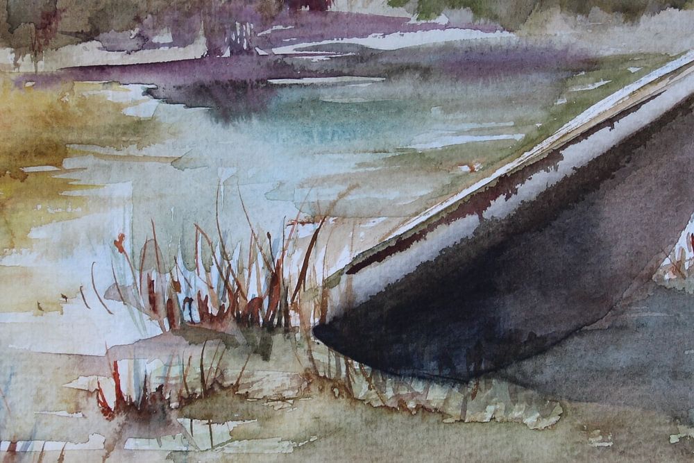 Laissez-vous transporter dans un lieu de paix et de sérénité avec le tableau Quiet Waterfront. Cette aquarelle capture l'instant feutré d'un bateau abandonné sur le rivage, entouré d'une eau calme et de douces couleurs naturelles.