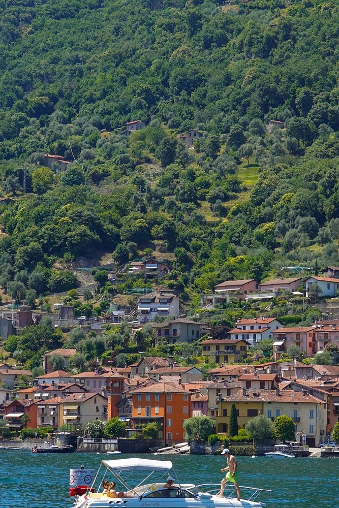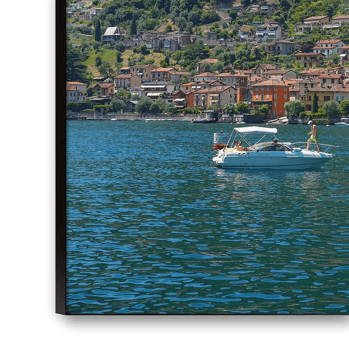 Au pied de collines verdoyantes, un ruban coloré de cottages se reflète doucement dans les eaux d'un bleu profond du lac de Côme. Le soleil de l'après-midi éclaire chaleureusement les façades, tandis que de petites embarcations flottent tranquillement sur la surface miroitante. Au loin, les maisons disparaissent lentement dans la verdure, comme si le village avait grandi dans la nature.