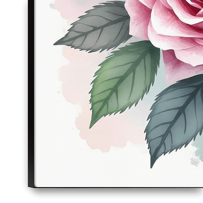 Une délicate illustration de style aquarelle représentant trois belles roses roses à différents stades de floraison, entourées de douces feuilles gris-vert. L'œuvre est douce et romantique, avec de subtiles variations de couleurs et un aspect légèrement texturé.