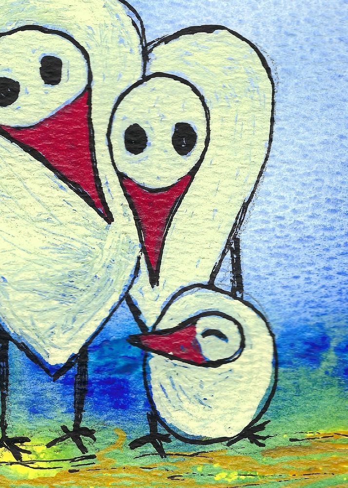 Cette œuvre d'art représente une scène d'harmonie entre des cigognes, dans un style minimaliste et ludique.
