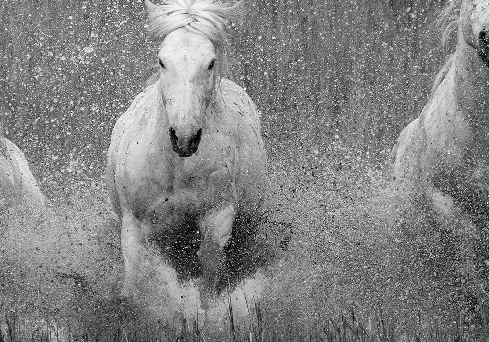 Trois chevaux camarguais en rang courent vers le photographe. Les chevaux courent dans l'eau. Les chevaux de Camargue sont les seuls chevaux assez forts pour courir dans l'eau salée boueuse qui fait partie des lacs provenant de la mer. Il s'agit d'une photo en noir et blanc.