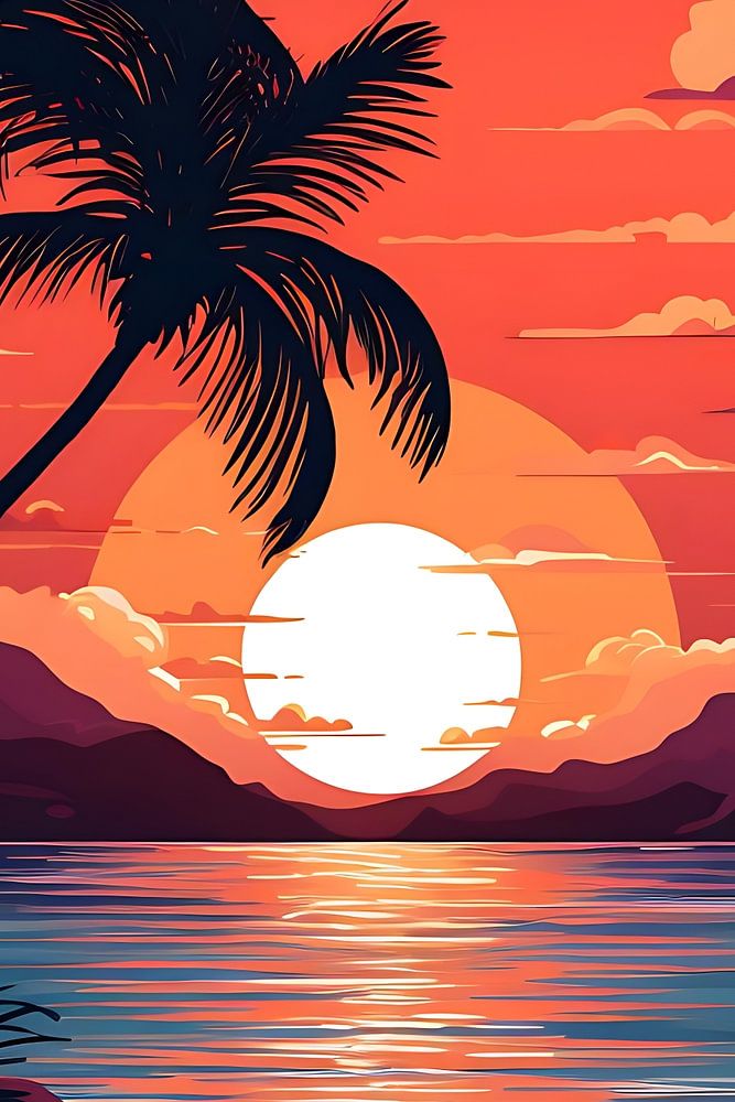 Een eigentijds kunstwerk toont een paradijselijk eiland met prachtige witte zandstranden en een turquoise oceaan. Palmbomen wiegen in de zachte bries en kleurrijke bloemen fleuren het landschap op. De gedurfde kleuren en abstracte vormen vangen de exotische en betoverende sfeer van dit tropische paradijs, waardoor de kijker wordt meegevoerd naar een plek van rust en sereniteit.