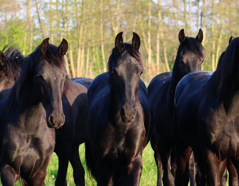 Achetez cette œuvre d'art de paysage Troupeau de chevaux frisons par Femke Haarsma sur toile, aluminium, ArtFrame ou photographie (encadrée), impression d'art en haute qualité et tout format.