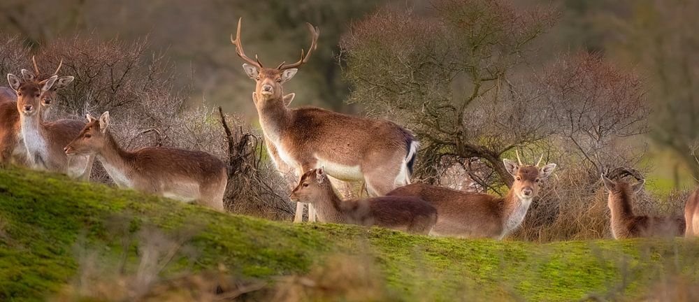 Troupeau de daims broutant dans les collines des dunes d'approvisionnement en eau d'Amsterdam. Le mâle se tient au milieu de la meute et surveille de près les alentours. La lumière du soleil se répand sur le dos des cerfs.