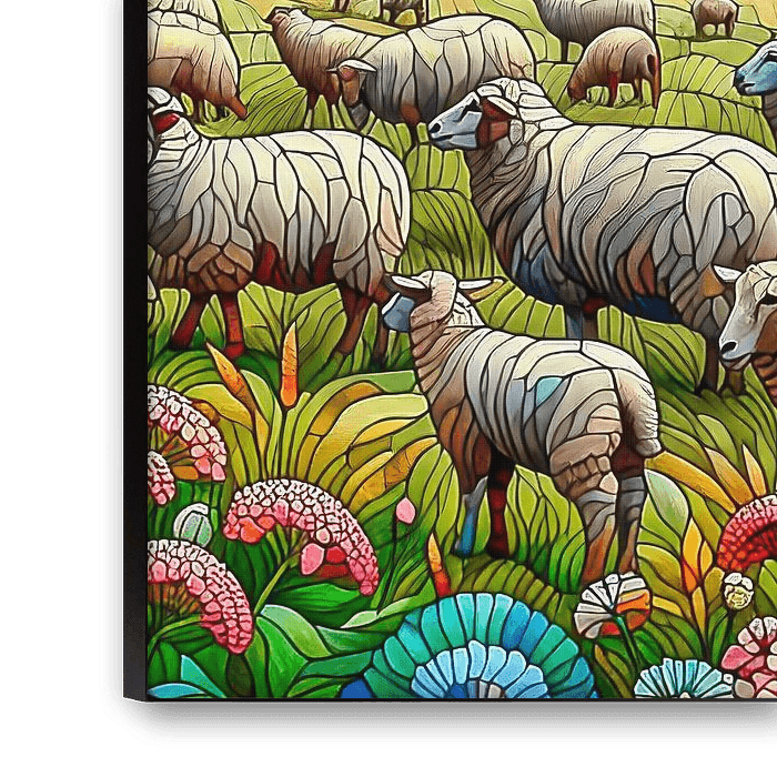 Achetez cette œuvre d'art de paysage Troupeau de moutons dans la prairie en style vitrail par Digital Art Nederland sur toile, aluminium, ArtFrame ou photographie (encadrée), impression d'art en haute qualité et tout format.
