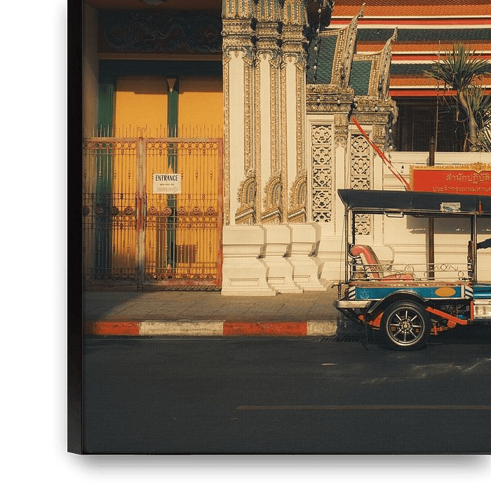 À propos de ‘Tuk Tuk devant un temple : Bangkok dans la lumière du matin’ par NZME Photography