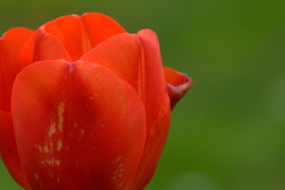 Cette unique tulipe rouge brillait le long d'une prairie. Un champ entier de tulipes est très beau, mais une seule tulipe est aussi très belle. La couleur rouge de cette tulipe est vive et va plutôt vers l'orange. Le fond vert de l'herbe est flou et la tulipe s'y détache bien.