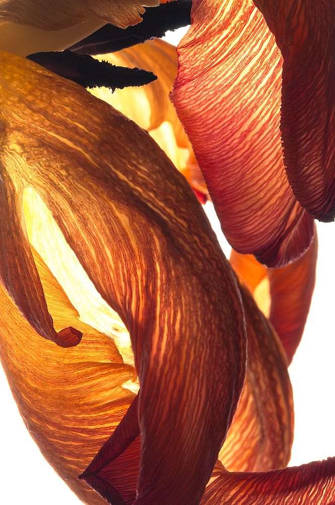 Avant d'être photographiée, cette tulipe a d'abord été séchée, ce qui a permis de créer des formes élégantes dans les pétales au fur et à mesure du séchage. Cela donne à chaque tulipe une forme unique. Lors de la photographie, j'ai utilisé le contre-jour pour faire ressortir clairement les lignes et les veines, ce qui donne une nature morte artistique pleine de détails.