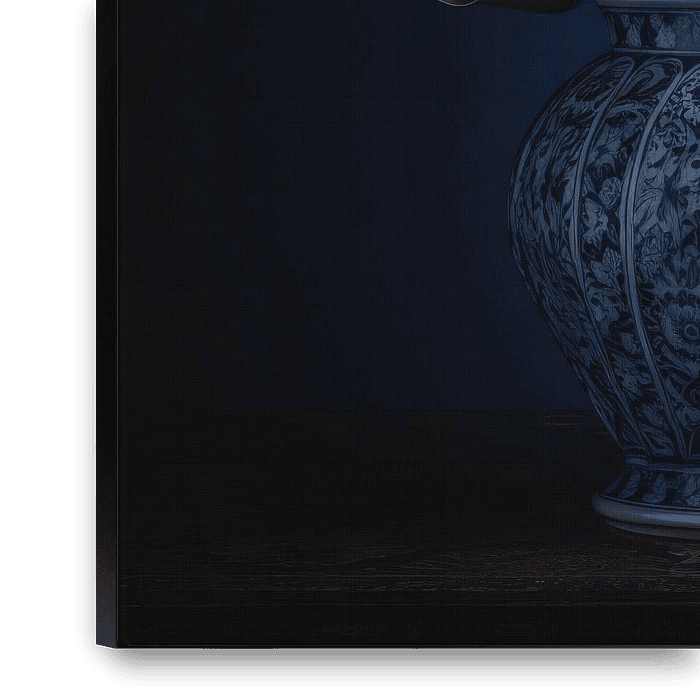 Vase bleu Delft avec des tulipes blanches avec un accent bleu dans le style des anciens maîtres du 17e siècle. Les tulipes ressortent magnifiquement sur le fond sombre. Convient aussi bien aux intérieurs modernes que classiques.