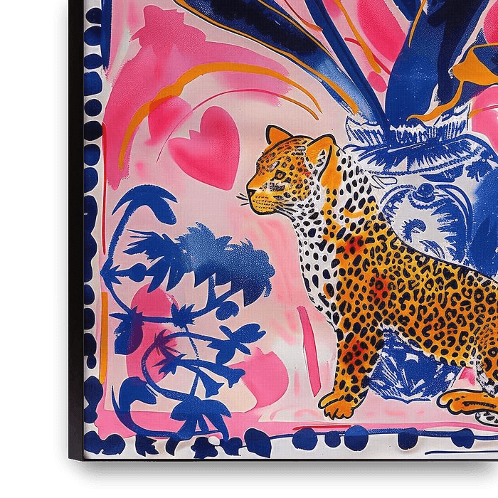 Cette œuvre d'art est une composition vibrante et expressive représentant un léopard exotique et un bouquet de tulipes dans un vase orné.