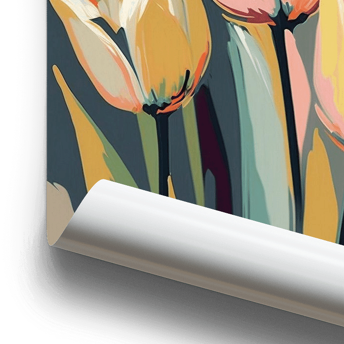 Illustration de médias mixtes avec des tulipes aux couleurs pastel dans un style rétro.