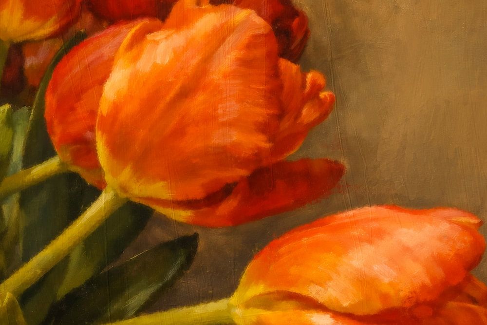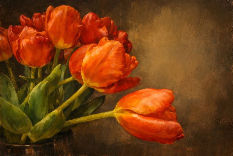 Cette peinture florale classique représentant des tulipes dégage une impression de chaleur, d'élégance et de beauté intemporelle. Les tulipes orange et rouges forment un accent de couleur puissant sur un fond sombre et sobre, inspiré de l'atmosphère des anciens maîtres de la peinture néerlandaise. La lumière douce et les détails…