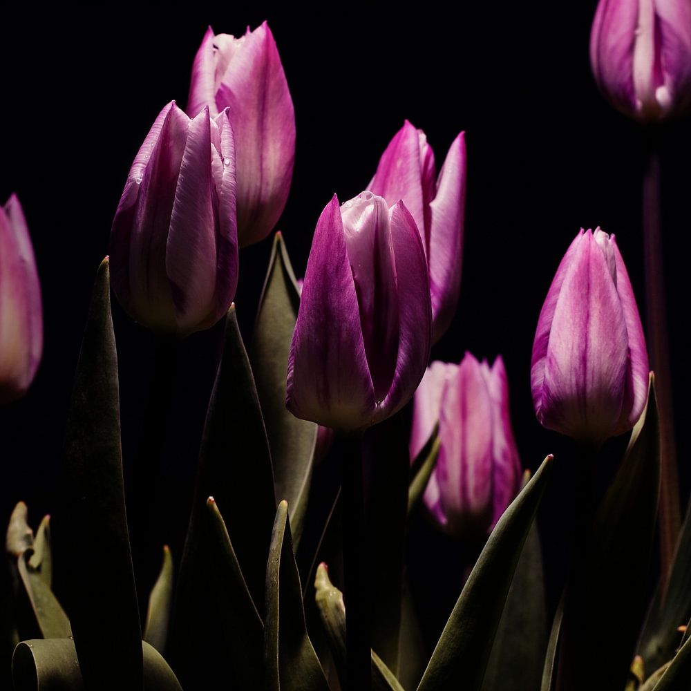 Des tulipes violettes, juste avant la période de floraison. Les tulipes contrastent fortement avec l'arrière-plan, mais il s'agit toujours d'une image fraîche, qui attire l'attention sur votre mur.