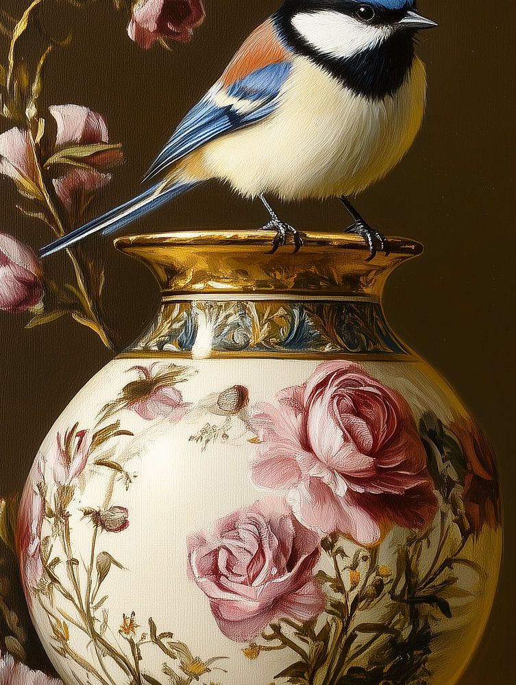Portrait d'un oiseau sur un vase à fleurs.