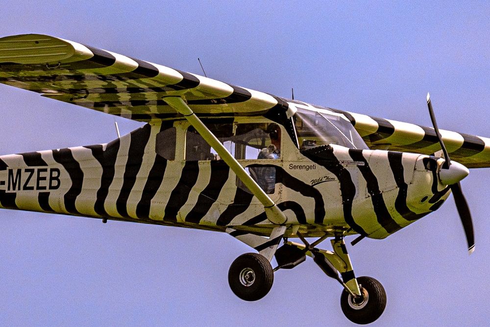 Cette image montre un avion monomoteur avec un motif zébré remarquable sur les ailes et le fuselage. L'avion, immatriculé D-MZEB, vole dans un ciel bleu clair. Il s'agit d'un petit avion à hélices.