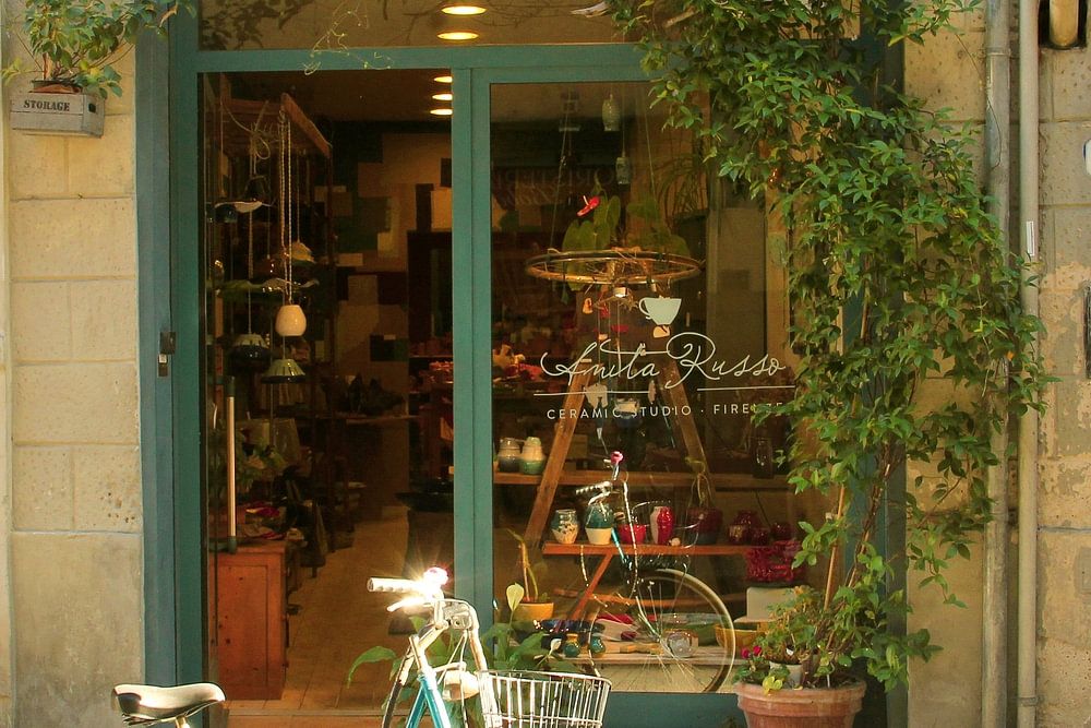 Cette photographie capture l'élégance tranquille d'une rue florentine baignée par la douce lumière de l'après-midi. Une bicyclette bleue d'époque repose délicatement sur le trottoir tandis que le lierre grimpe sur la façade d'un studio de céramique pittoresque, niché entre des portes en bois richement vieillies. Le mélange des textures - pierre, bois et verdure - incarne le charme intemporel de l'âme architecturale de la Toscane. Idéal pour les amateurs de voyages, de scènes européennes rustiques et de détails urbains douillets.