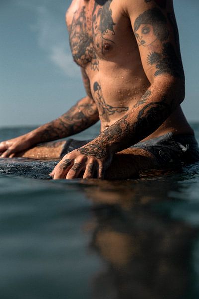 Surfeur avec de nombreux tatouages, assis, attendant une vague