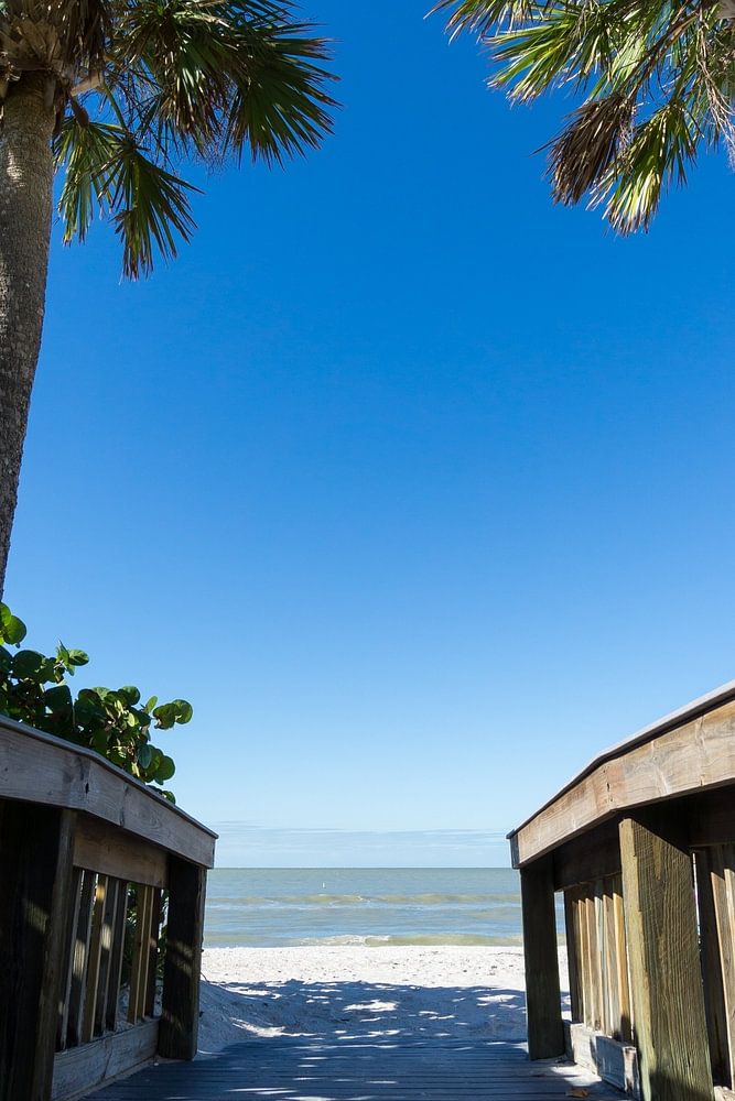 USA, Floride, Deux palmiers derrière la piste d'atterrissage vers une plage de sable blanc parfaite avec un ciel bleu.