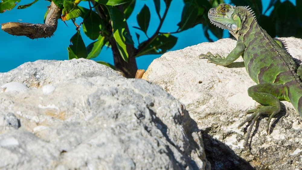 A propos de "USA, Floride, Iguane vert géant assis sur d'énormes rochers"