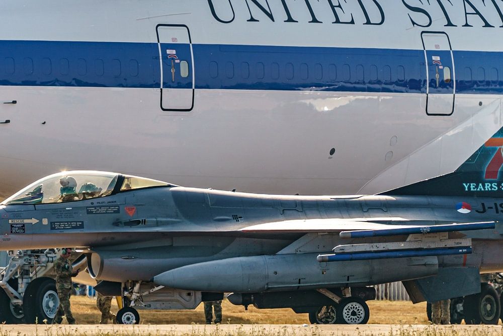 Le F-16 Klu (J-197) du 312 SQN roule devant un Boeing E-4B.