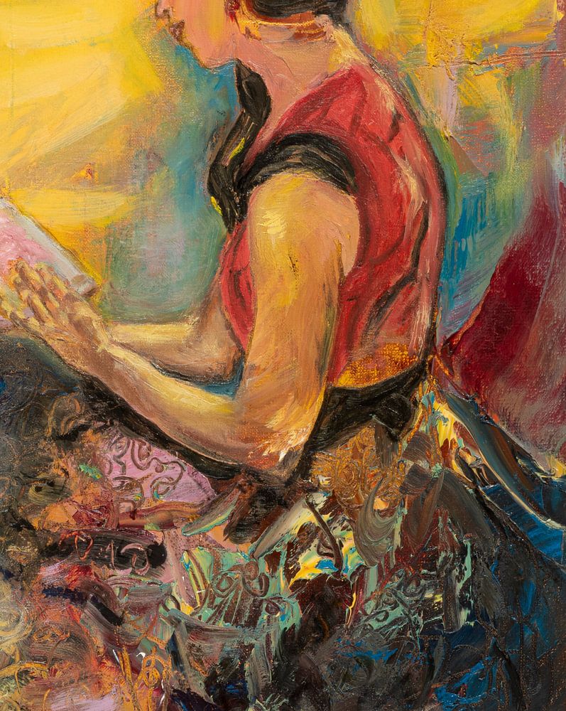 solidité et douceur, tandis que la figuration et l'abstraction de sa jupe sont entrecoupées de formes et de taches réalisées à la spatule.