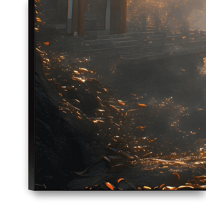 Dans cette œuvre d'art, nous voyons un ancien guerrier solitaire debout sur le rebord d'une montagne, face à une vallée remplie de brume et de lumière dorée. Il est vêtu d'une armure ornée, avec un tissu d'un bleu profond qui coule derrière lui, et de petits détails sculptés et des ornements métalliques attachés à ses vêtements - de minuscules éléments qui ajoutent des histoires et de la personnalité à sa présence. De l'autre côté de la vallée, de magnifiques temples traditionnels de style pagode s'élèvent au-dessus du brouillard, leurs toits brillant de la même lumière chaude du soleil qui filtre à travers les feuilles d'automne. J'ai créé cette scène avec le sentiment d'une dignité silencieuse - le moment avant une grande décision, lorsqu'une personne doit se tourner vers l'intérieur et faire face à son chemin. J'ai toujours été inspirée par les vieux films fantastiques asiatiques et les histoires sur l'honneur, la loyauté et le destin. Cette œuvre dégage une atmosphère chaleureuse, remplie d'or en fin d'après-midi, et un sentiment de tension paisible. Il s'agit de se tenir courageusement entre ce que l'on était et ce que l'on peut encore devenir. Pour un intérieur, cette œuvre d'art apporte une présence dramatique mais apaisante - parfaite pour quelqu'un qui aime les récits épiques, les mondes fantastiques culturels et les moments où l'imagination et l'émotion se confondent.