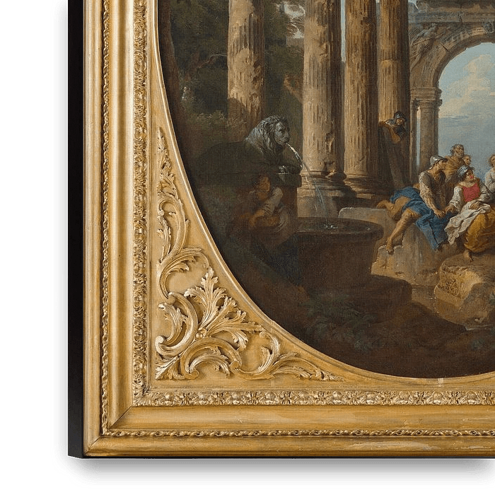 L'un des deux ovales, L'Archéologue et Un Apôtre prêchant, qui sont entrés en possession de l'Académie dans le cadre du legs Fabio Rosa en 1753. Le peintre a été élu à l'Académie en 1719 et est devenu un personnage si important au sein de l'institution qu'il a été élu "Principe" en 1755. Dans ce tableau, Panini place à nouveau ses personnages dans un paysage romain caractérisé par la présence de monuments antiques et d'objets inventés.
