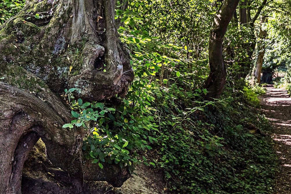 Racines de forme irrégulière d'un arbre le long d'une route creuse de Camerig à la Geul à Epen dans le Pays des Collines du Limbourg Sud.