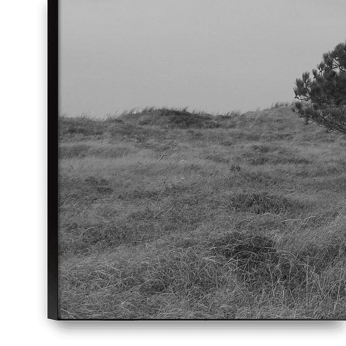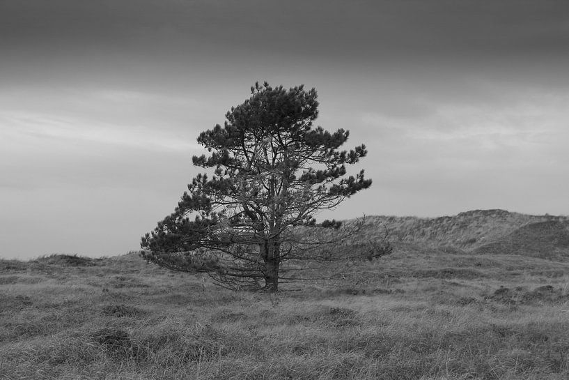 Un arbre solitaire dans la campagne Cette photographie en noir et blanc montre un conifère solitaire qui se dresse fièrement au milieu d'une prairie vallonnée. L'absence de couleur met en valeur les formes, les textures et le caractère serein du paysage. L'arbre dégage une impression de calme, de force et une touche de mélancolie qui…