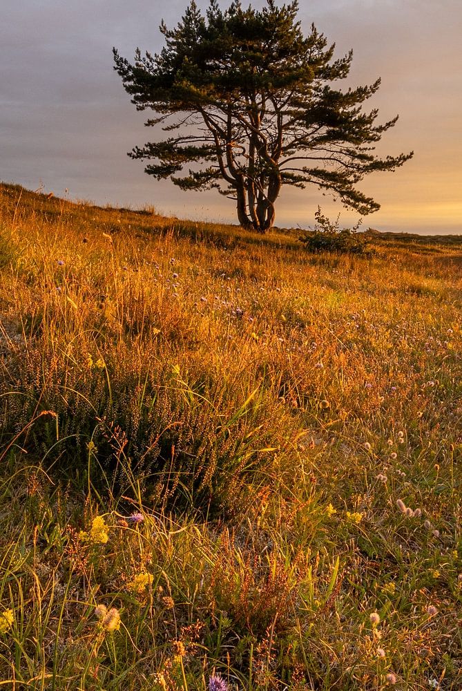 Les Grave Dunes de Den Helder sont une vaste réserve naturelle sur la côte de la mer du Nord, où les grands herbivores se promènent également en toute liberté. C'est un endroit merveilleux pour se promener, photographier et se détendre. À l'heure dorée, le soleil couchant irradie d'une chaude lueur dorée la bruyère et le pin solitaire. Une scène apaisante où l'on s'arrête et que l'on apprécie.