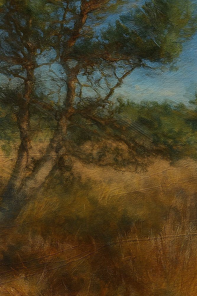 J'ai créé cette peinture à l'aide de techniques numériques, en me basant sur une photographie que j'ai prise moi-même sur la Kalmthoutse Heide, une réserve naturelle unique située à la frontière belgo-néerlandaise. La Kalmthoutse Heide est connue pour ses vastes paysages de landes, ses plaines ouvertes, ses dunes de sable et ses pins caractéristiques, comme on peut le voir dans cette œuvre.