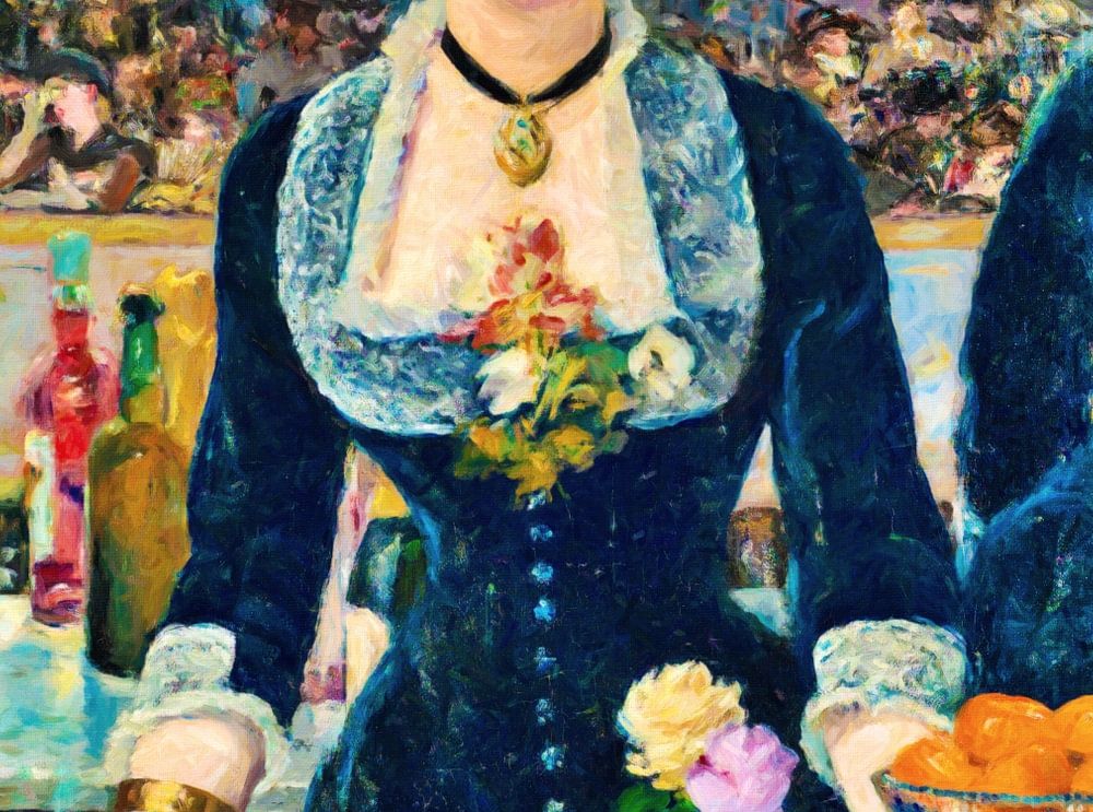 Une femme se tient derrière un bar, entourée de bouteilles et de verres, tandis qu'un homme regarde son reflet dans un miroir. Les Folies-Bergère étaient le premier music-hall de Paris. Ce tableau est la dernière œuvre majeure de Manet, exposée au Salon de Paris en 1882.