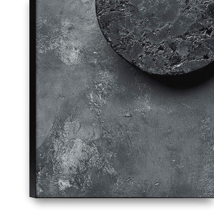 Cette photo d'art montre un cercle de béton foncé reposant élégamment sur une surface de béton plus clair. Les tons contrastés soulignent les lignes et les formes épurées, créant un effet dynamique et contemporain. Le jeu d'ombre et de lumière crée une profondeur et une dimension subtiles, mettant en valeur la simplicité du design.…
