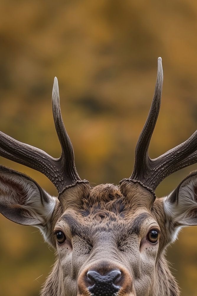 Ce portrait impressionnant montre un cerf rouge majestueux dans toute sa splendeur, pris dans un moment de calme et de dignité parfaits. Ses imposantes ramures se dressent comme une couronne naturelle au-dessus de sa noble tête, tandis que ses yeux vigilants regardent droit dans l'objectif. Les tons chauds et bruns de sa fourrure s'harmonisent parfaitement avec la lumière dorée de l'automne en arrière-plan.