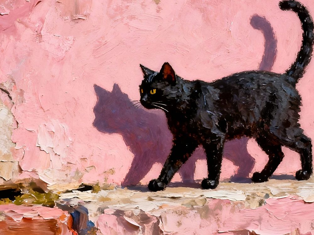 Minimaliste mais néanmoins expressif : un chat noir se déplace avec élégance le long d'un mur rose texturé. Le fort contraste de couleurs entre l'animal sombre et le fond clair crée une tension visuelle évidente. La texture grossière et les traces de pinceau visibles confèrent à l'œuvre un aspect artisanal et artistique. La composition…