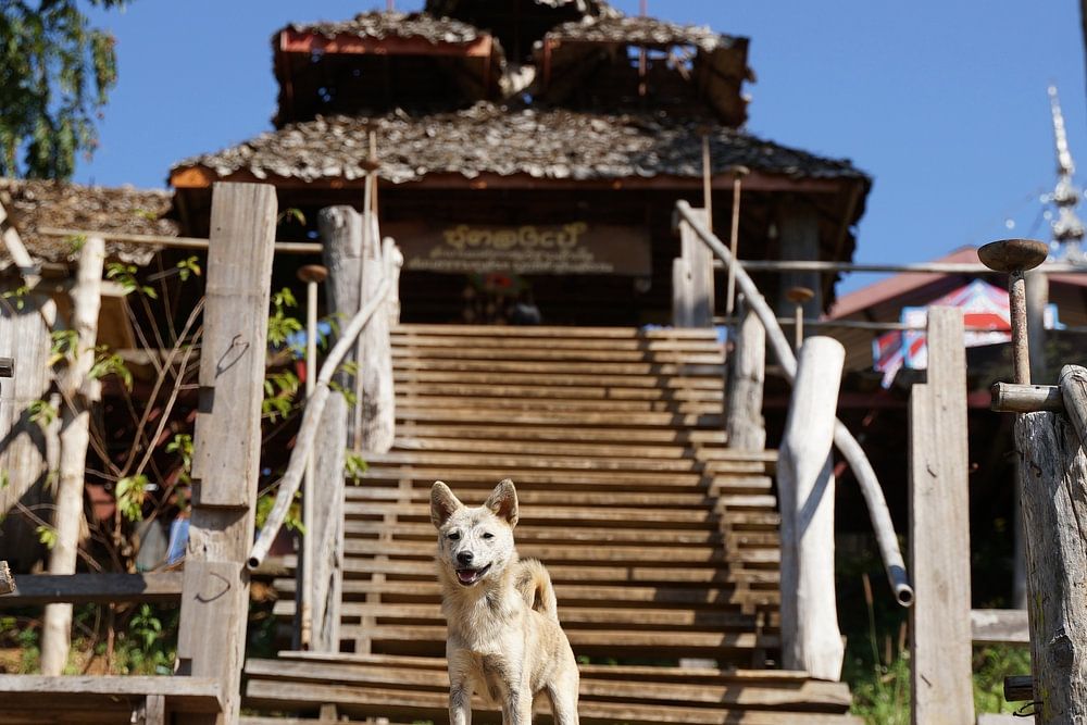 Dans un temple bouddhiste en Thaïlande, ce chien surveille de près.