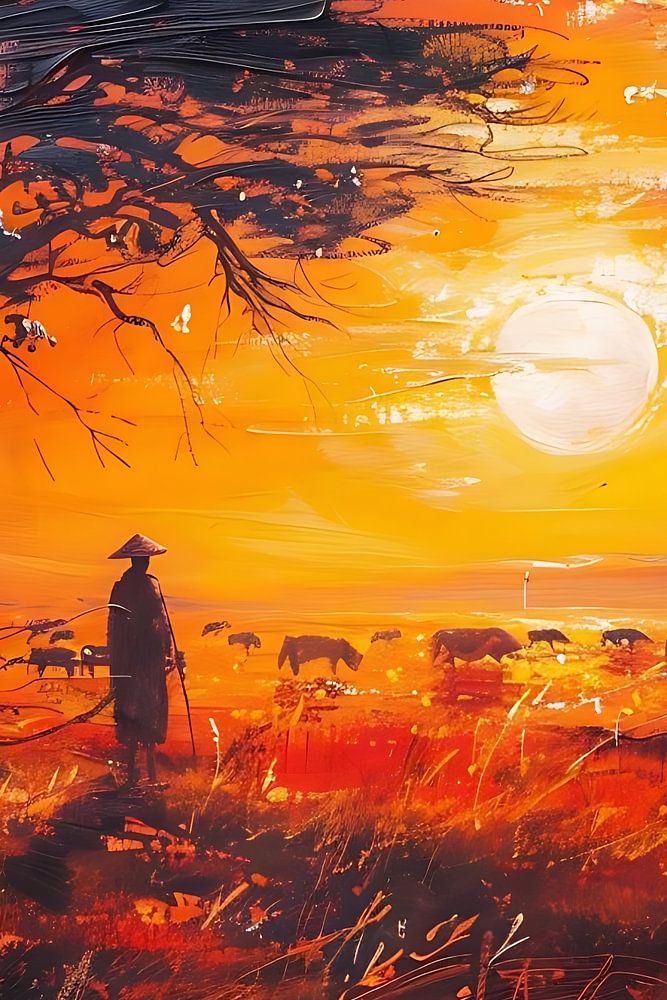 Un éleveur de Samburu vit un premier contact en observant, sous un arbre isolé, un monolithe géant qui recouvre le soleil au loin. Ses troupeaux s'inquiètent. L'art du pastel brut avec des lignes simples, des tons de coucher de soleil et une atmosphère surréaliste capturent parfaitement ce moment magique.